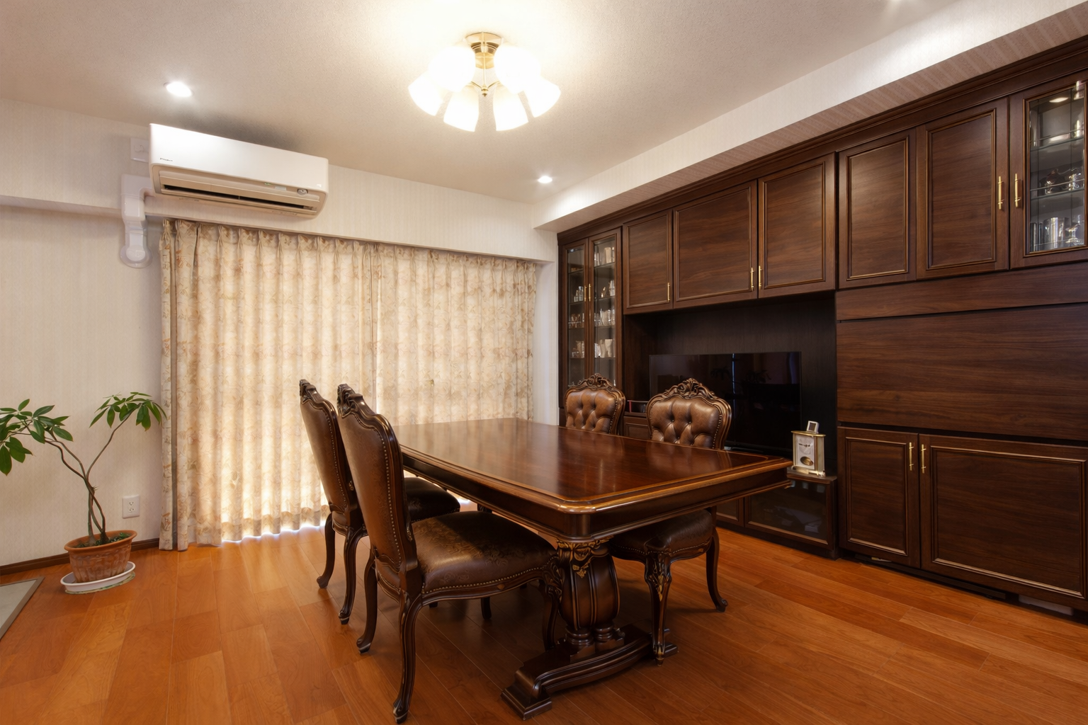 クラシックな家具がお好みのお施主様で、ダイニング部分を高級感が出るように落ち着いた色合いの仕上げ材を選定しました。